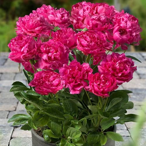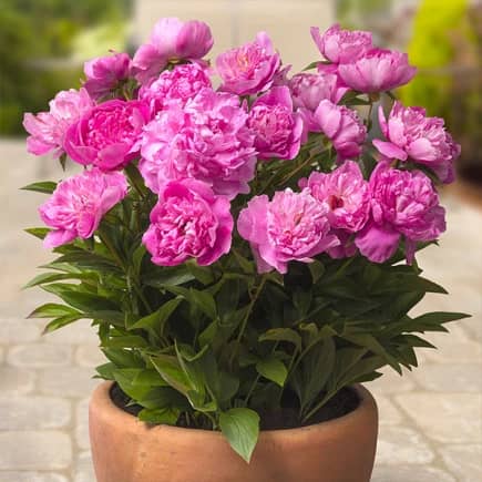 Тувакдаги пионлар кўпинча оптимал парвариш шароитлари ва сояга ёки қуёшга ўтиш қобилияти туфайли узоқроқ гуллаш даврига ега.