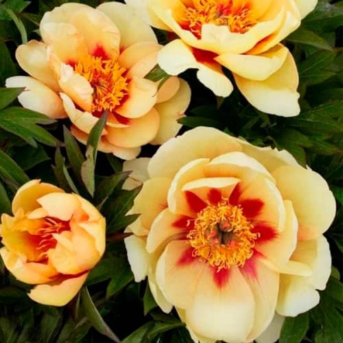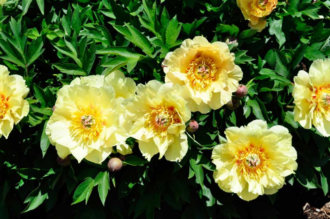 Ёрқин сариқ рангдаги гулларга ега бўлган дарахт пионларининг гибрид навлари яна гуллашга қодир – улар одатда аллақачон шаклланган гул куртаклари билан қишга борадилар ва тувакларда синфдан ташқари дистиллаш учун енг мос келади.